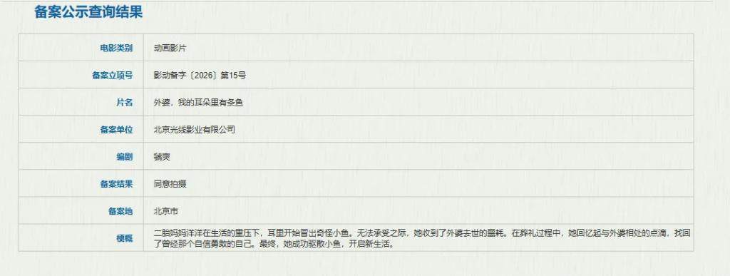 明朗影业的原创动画电影《外婆,我的耳朵里有条鱼》,由《中国奇谭》系列短片《乡村巴士带走了王孩儿和伟人》导演刘毛宁执导,《我在外乡挺好的》编剧虢爽讲求脚本。