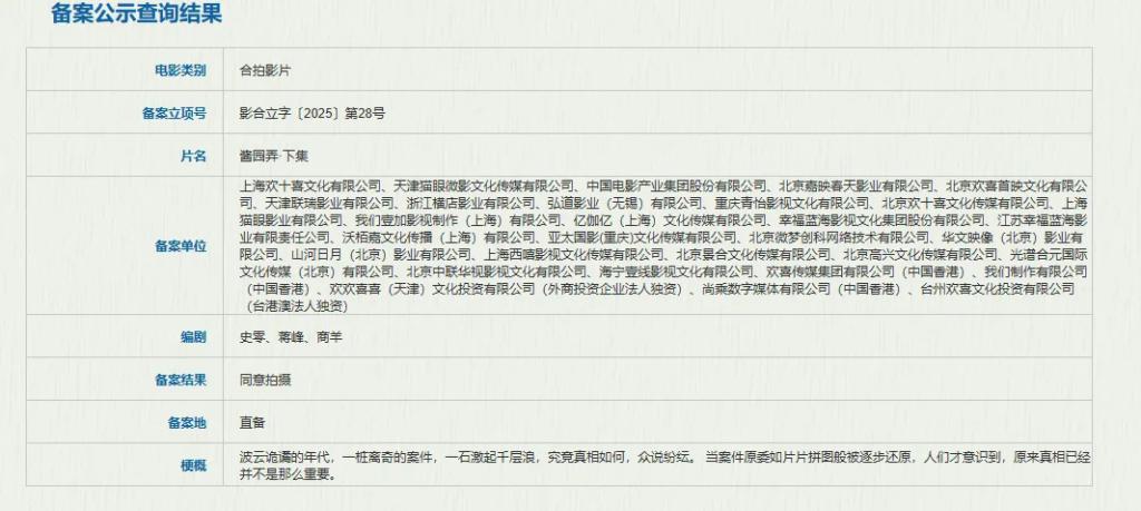 《酱园弄 · 下集》以合拍影片立项,备案单元达 30 多家公司,幕后鸿沟高大。故事爽快写谈:“当案件原委如片片拼图般被牢固收复,东谈主们才坚强到,原本真相照旧并不是那么垂危。”