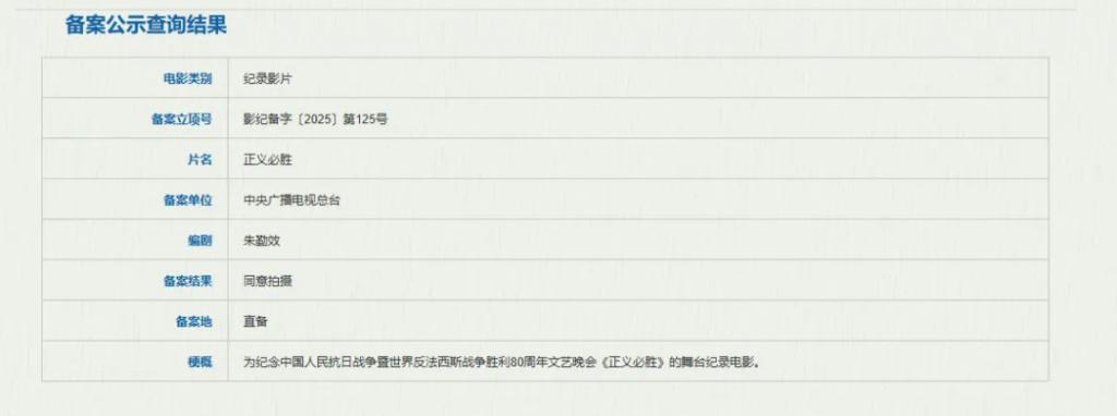 《正义必胜》则是为系念中国东谈主民抗日干戈暨世界反法西斯干戈胜利 80 周年文艺晚会《正义必胜》的舞台记载电影。两者共同以大银幕为载体,记得历史,阐扬伟大精神。