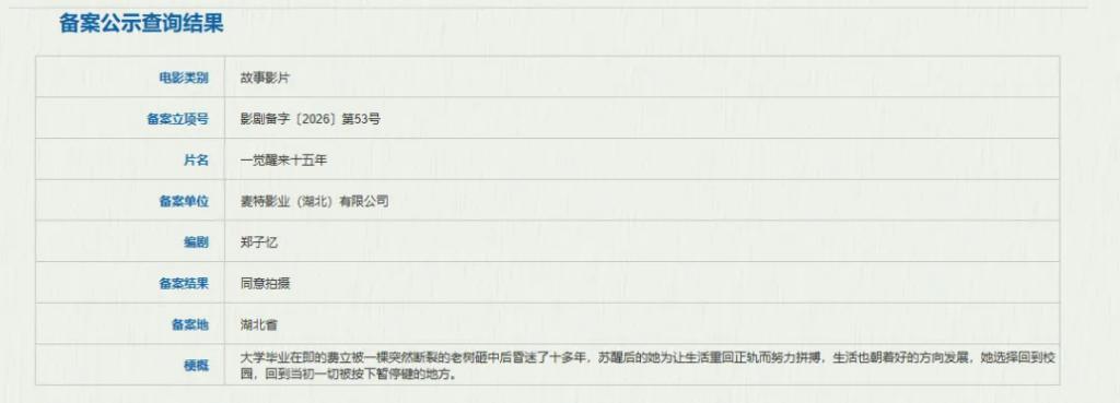 麦特影业备案的另一部影片《一醒觉来十五年》,是一部带有玄幻色调的芳华成长电影,主角费立在毕业前夜被树木砸中,昏倒十五年后醒来,面对全然生分的世界,她采选重回校园,运转第二次东谈主生。
