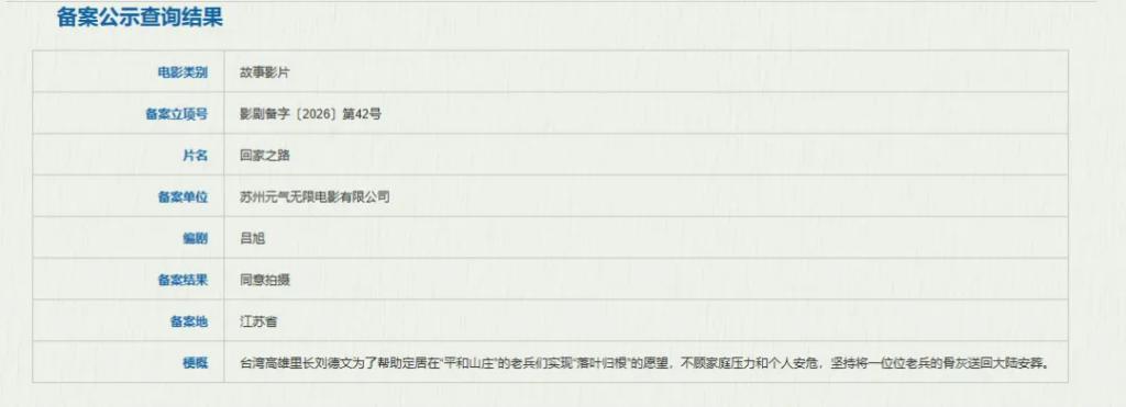 《回家之路》由推出过《快把我哥带走》《涉过震怒的海》《野孩子》《熊猫野心》等片的幕后电影东谈主吕旭担任编剧,主创声威暂未公布,期待打造出一部连合两岸血脉亲情的诚意之作。