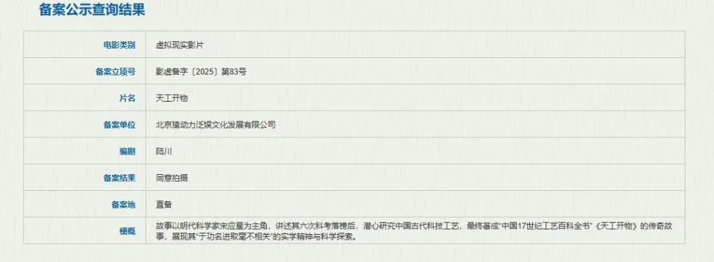 这部 VR 影片由陆川担任导演,聚焦明代科学家宋应星。影片再现他六次科考落榜后,潜心接头中国古代科技工艺,最终著成“中国 17 世纪工艺百科全书”《天工开物》的据说历程。
