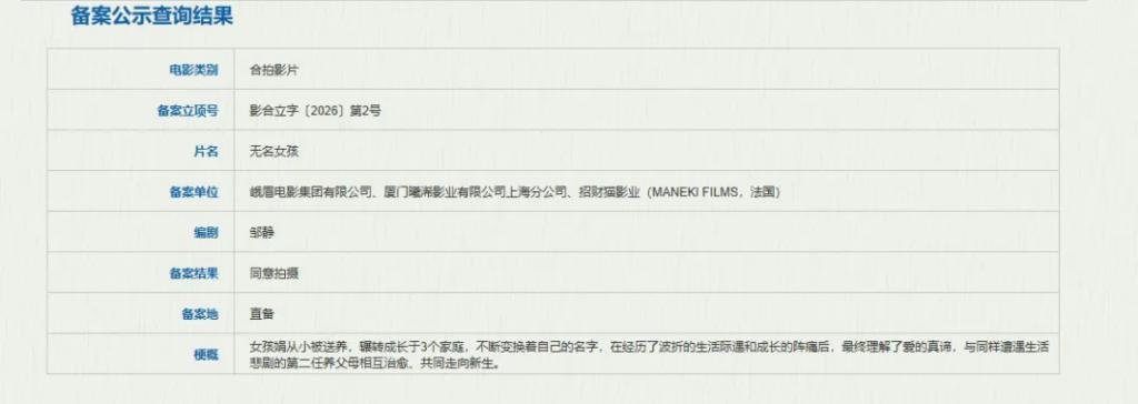 邹静导演的长片首作《无名女孩》由李庚希主演,脚本曾获戛纳影评东谈主周第十期 Next Step 长片脚本工坊首奖。