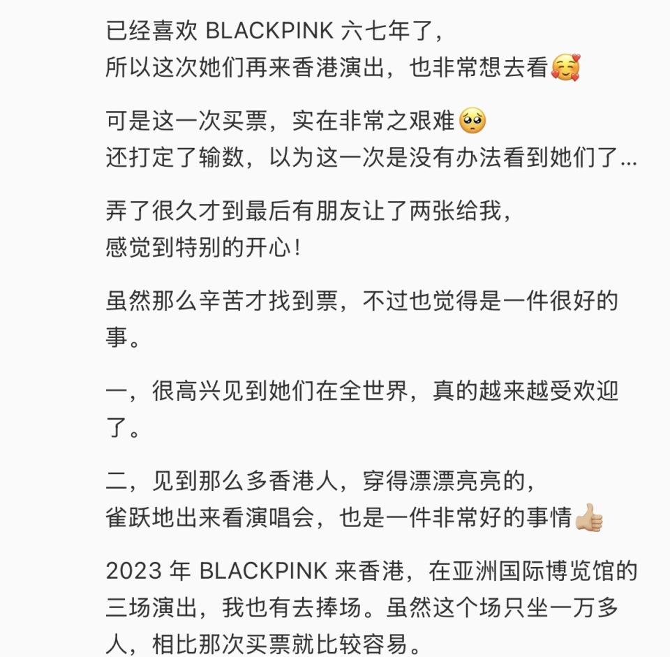 张曼玉遂愿且尽兴地看了 Black Pink 的献艺,是以她才会在献艺截止后试吃了演唱会的经过,况兼写下了感言。她示意在 2023 年这个女团来香港,在亚博献艺的本事,我方也来不雅看了,其时很容易买票,不像这一次根柢买不到。此外,她还称心爱她们那么久,以为她们舞蹈很面子,而且很竭力,让她看到女孩子与女孩子之间的真爱,相互相互协助,领悟使命,好扰乱。